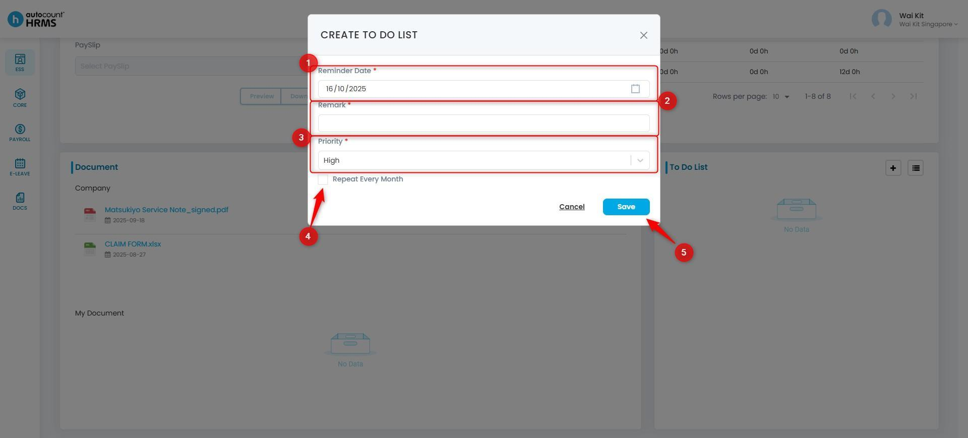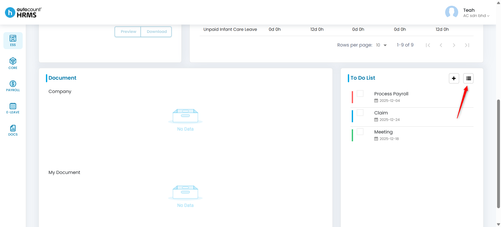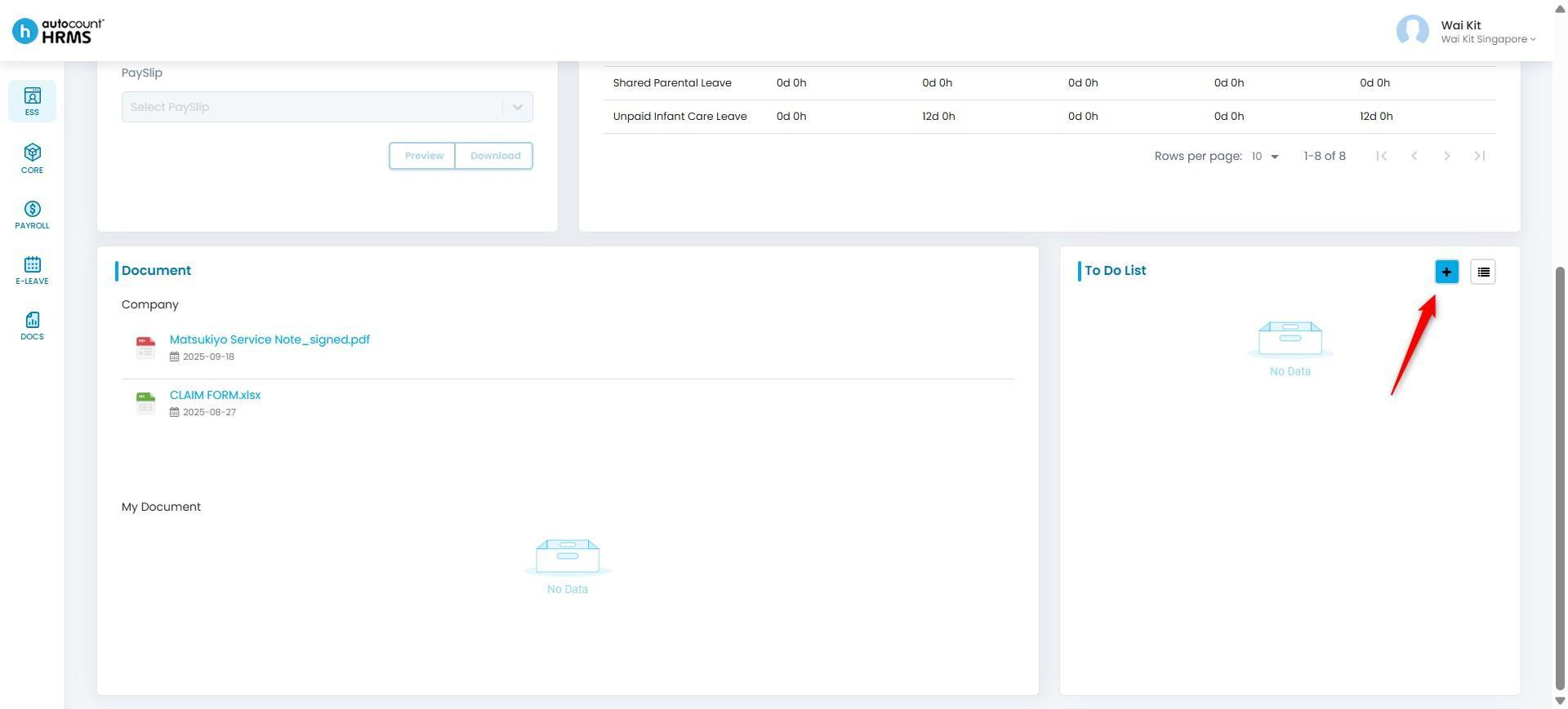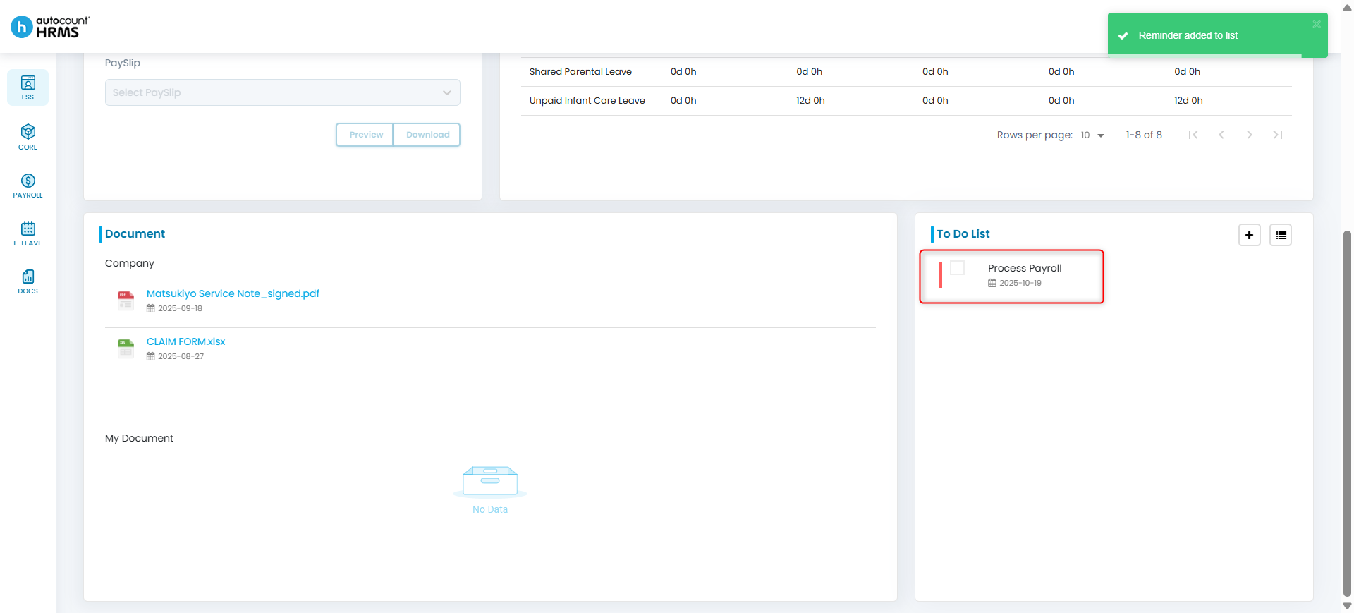 The ESS (Employee Self-Service) dashboard allows employees to create and manage their personal To-Do List, helping them stay organised and keep track of important tasks. In addition to managing to-dos, employees can also access their payslips and view their leave information.