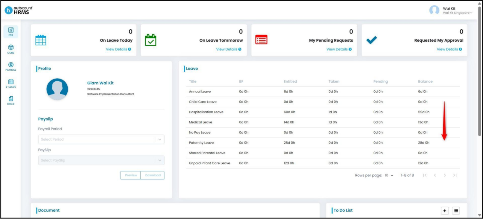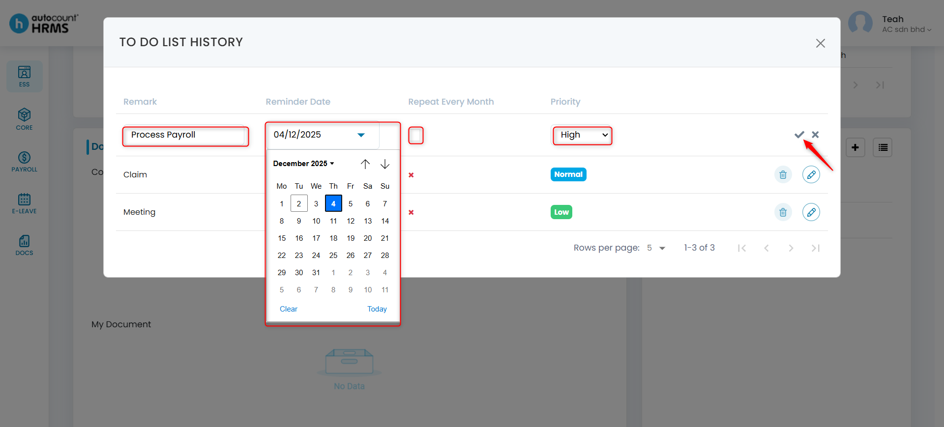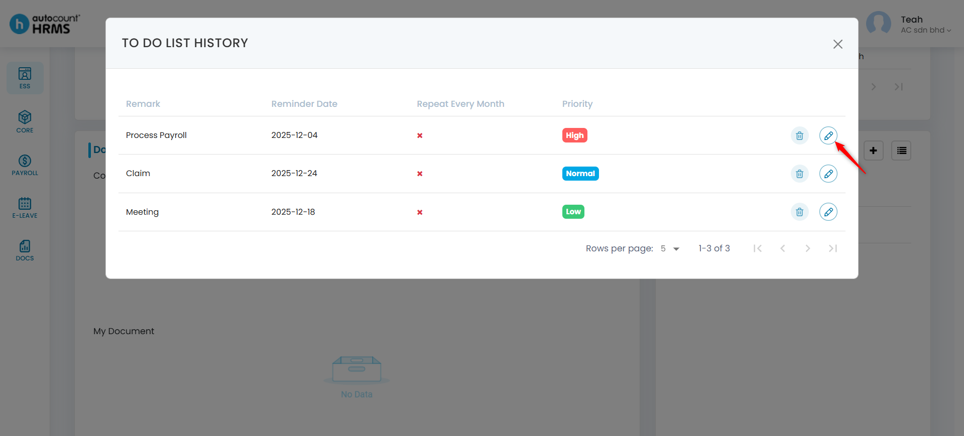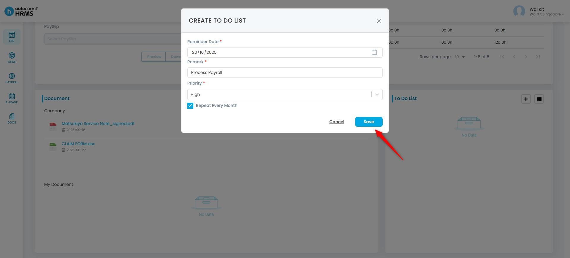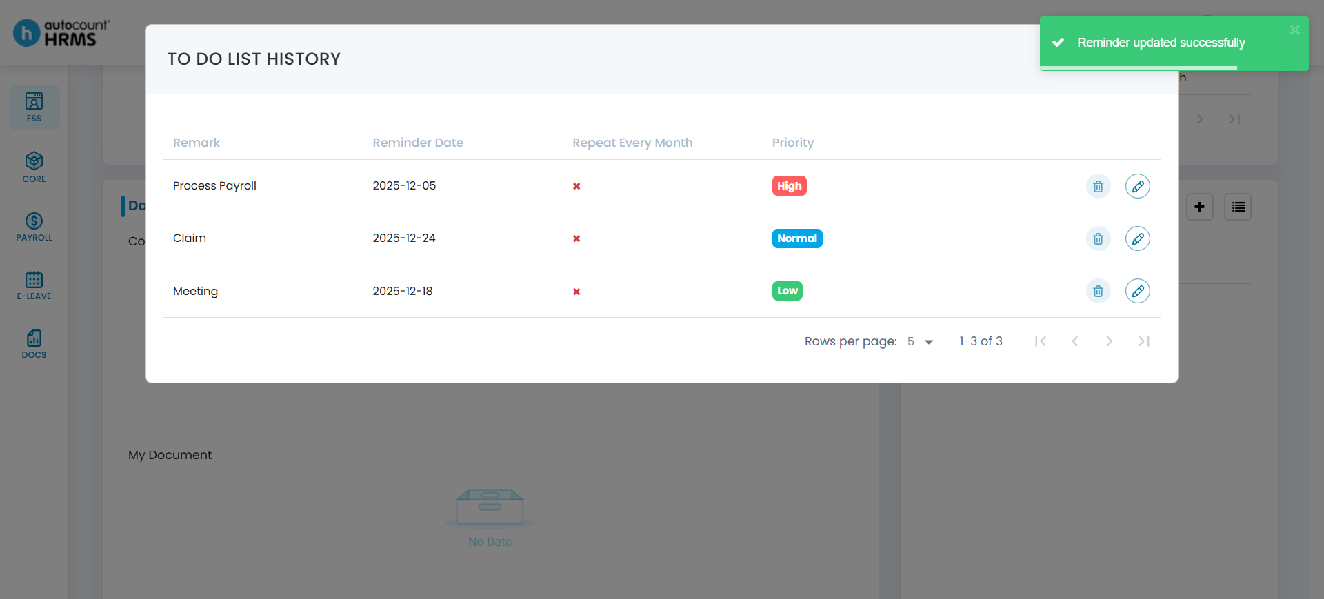 The ESS (Employee Self-Service) dashboard allows employees to create and manage their personal To-Do List, helping them stay organised and keep track of important tasks. In addition to managing to-dos, employees can also access their payslips and view their leave information.