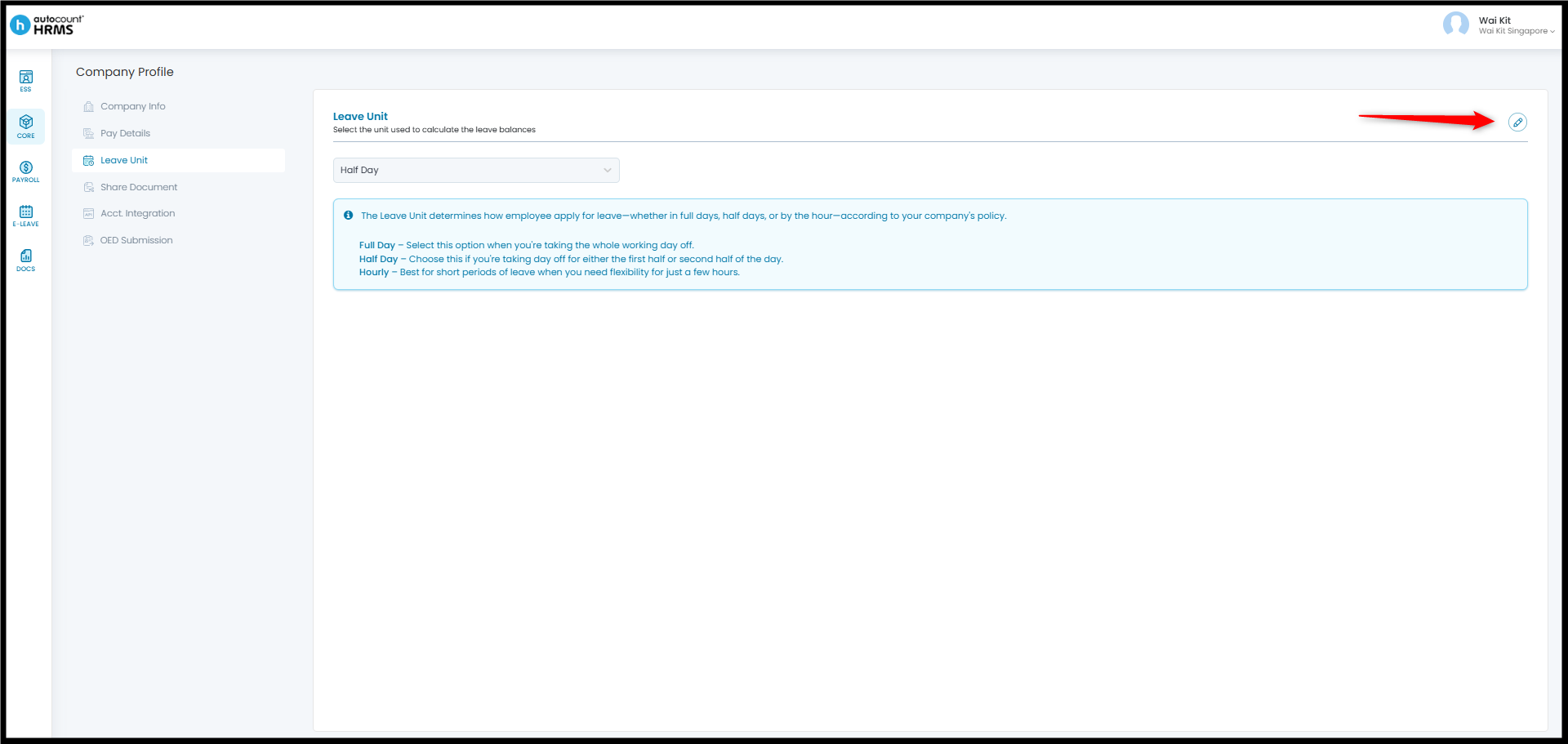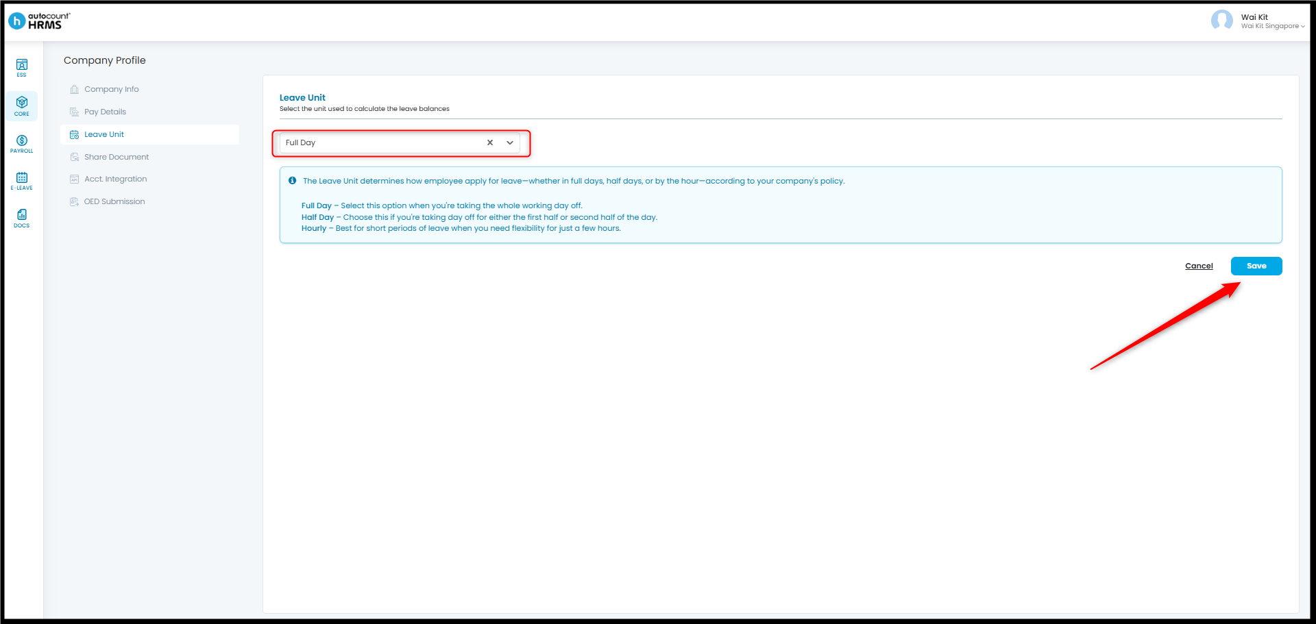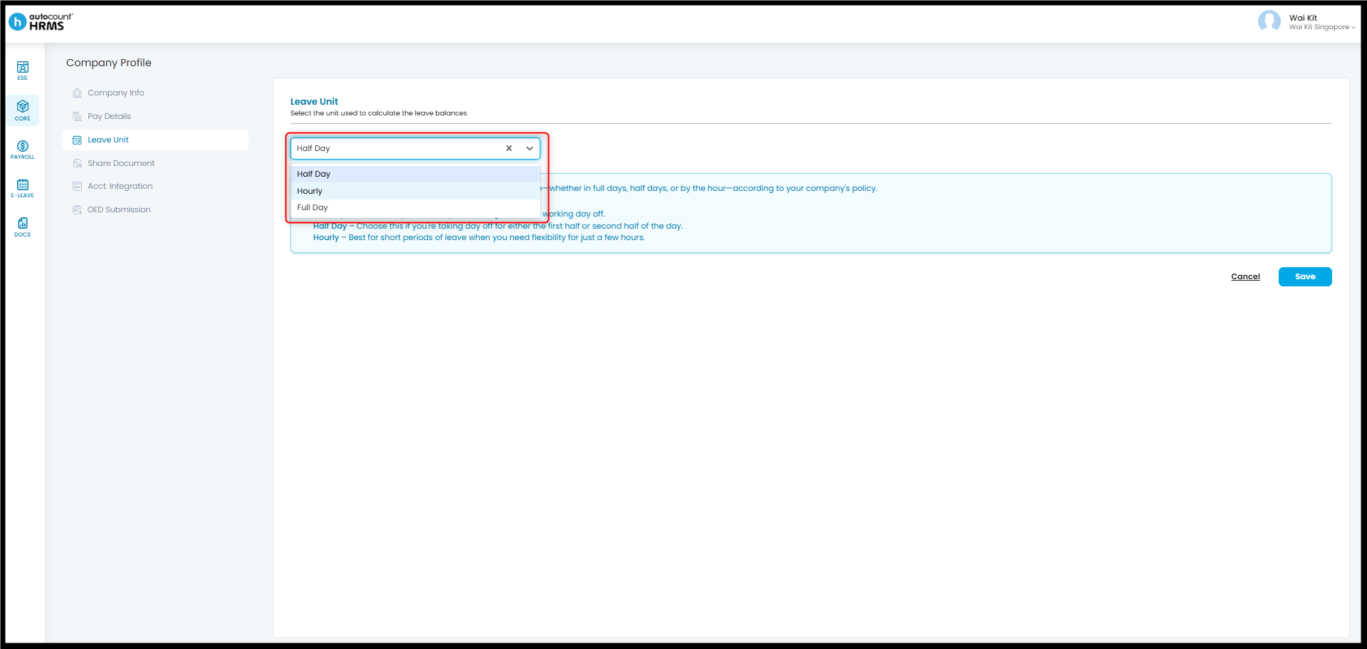 The Leave Unit determines how employees apply for leave—whether in full days, half days, or by the hour—based on the company’s leave policy. Configuring the correct leave unit ensures accurate leave application and balance calculations.