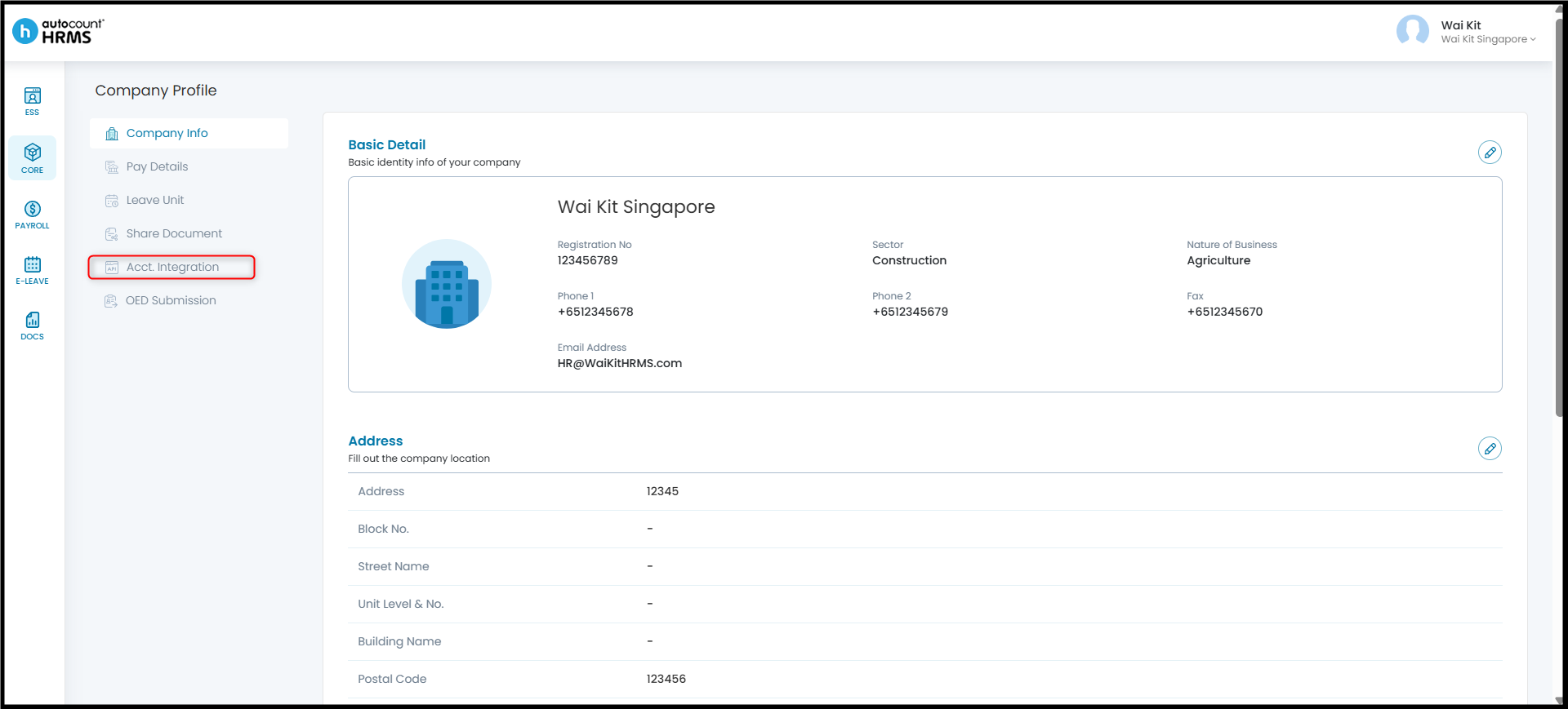 - Under Company Profile, click Acct Integration.