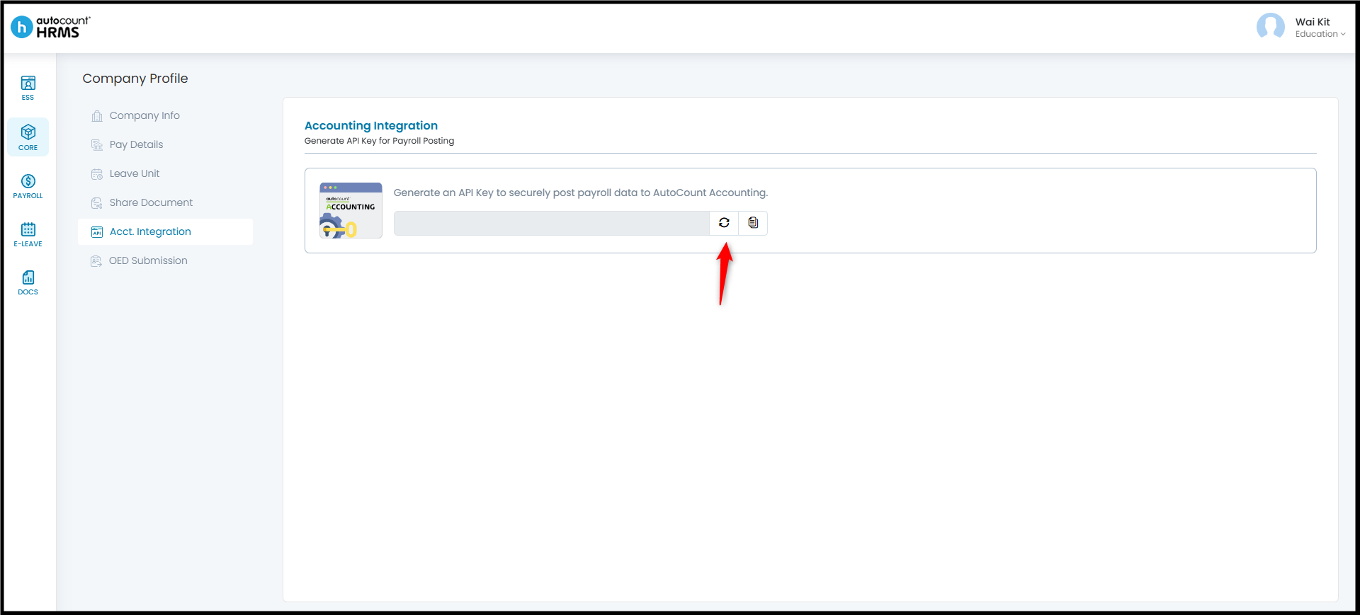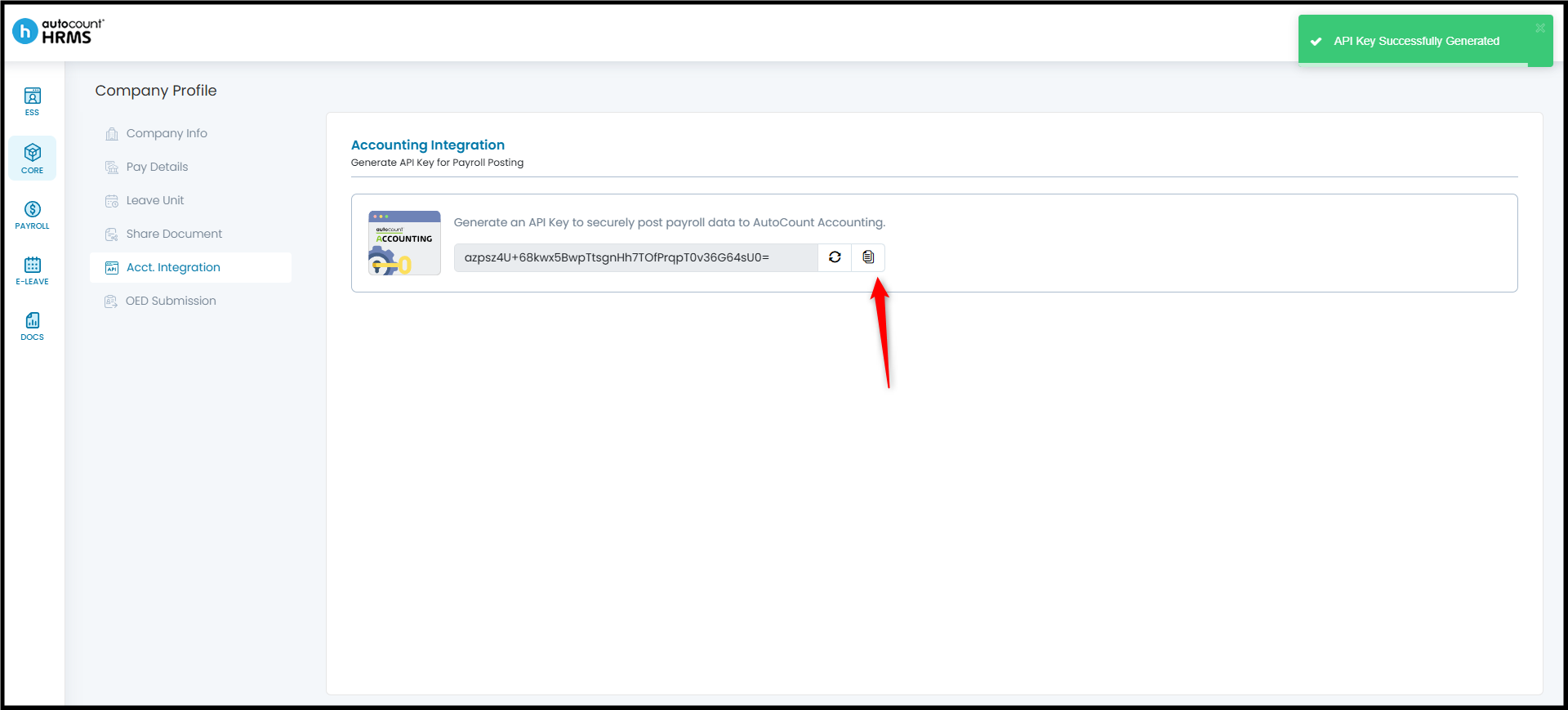 To enable the integration, an API Key must be generated in HRMS and then configured within AutoCount Accounting.