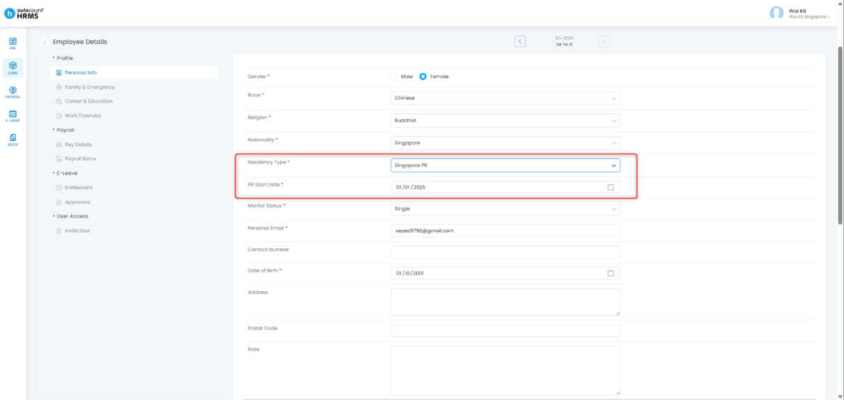 3. If the employee’s Residency Type is Singapore PR, select Singapore PR and enter the PR Start Date.