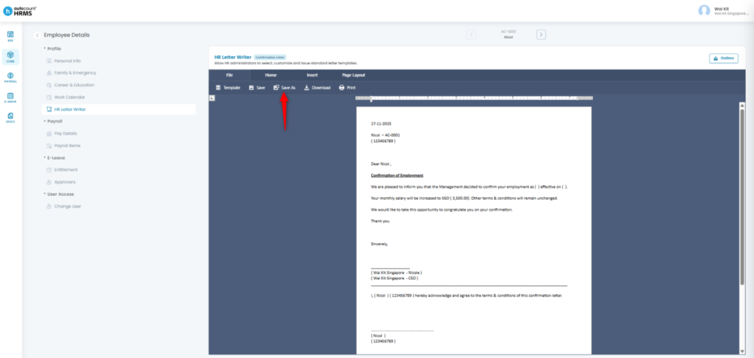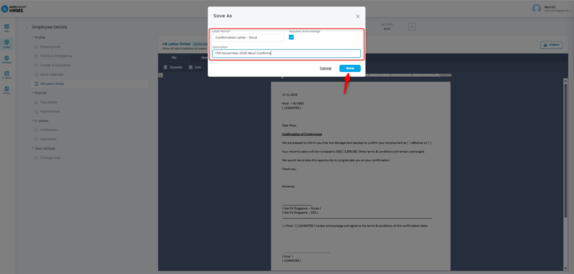 The HR Letter Writer allows HR users to generate, customise, and send official letters to employees directly through HRMS. It will also be kept within the employee's profile once it has been acknowledged by the employee themselves.