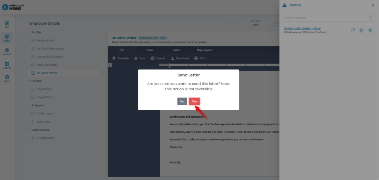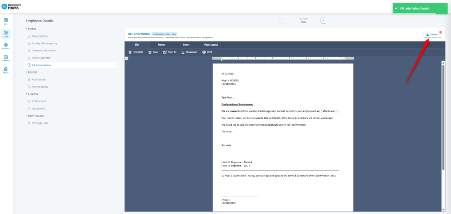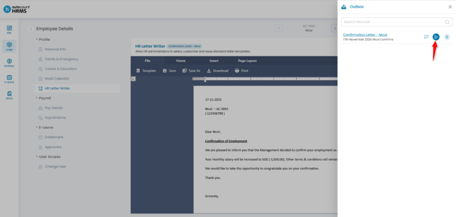 8. Go to Outbox and click the arrow icon to send the letter to the employee.