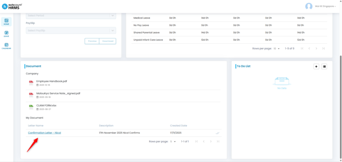 9. The employee can view the letter under Home > My Document, click the letter and then click Acknowledge to acknowledge receipt.