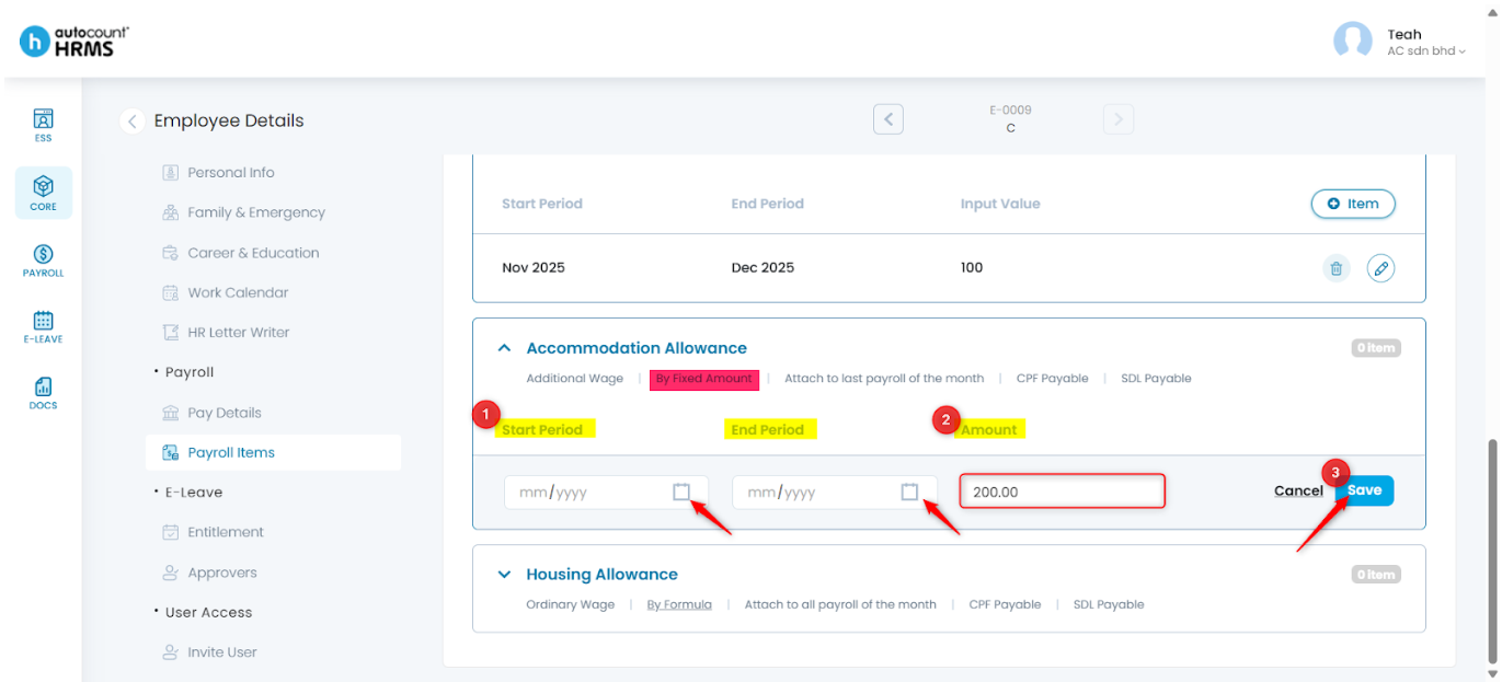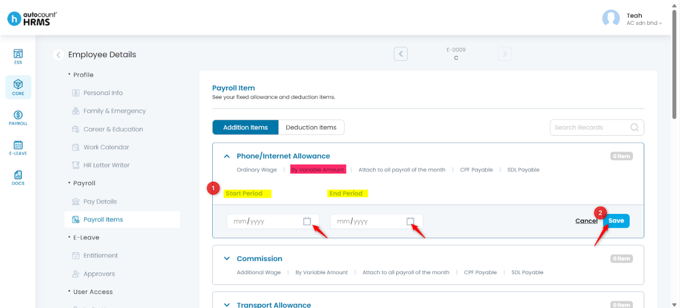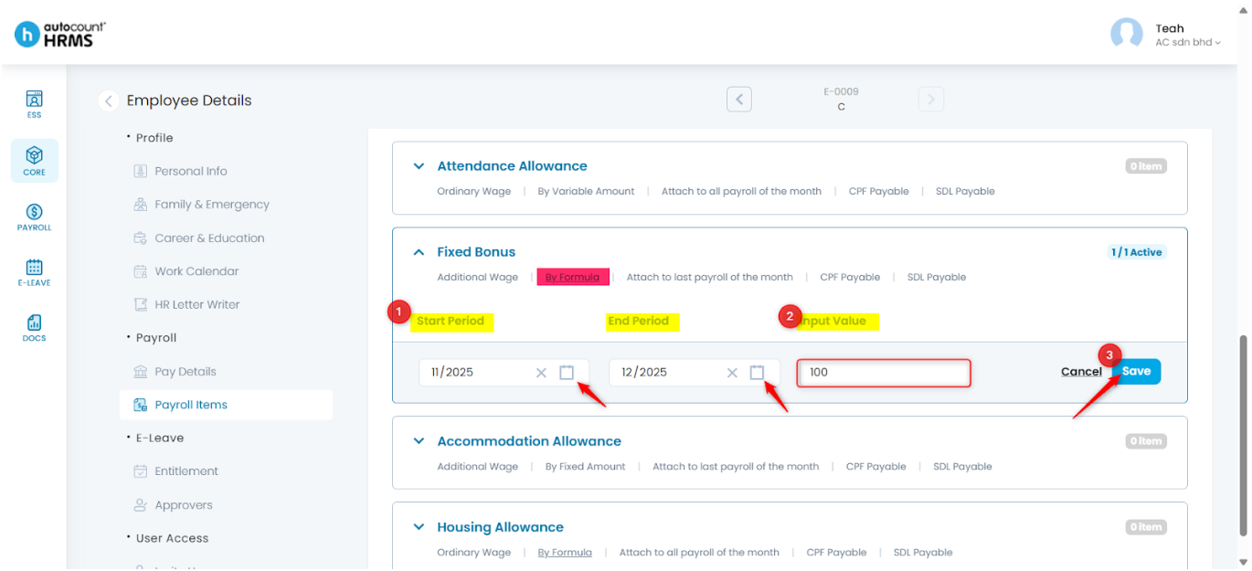 Payroll Items are used to maintain fixed or recurring allowances and deductions for employees. Once set up, these items will be automatically included in the employee’s payroll during each payroll run, ensuring consistent and accurate payroll processing.