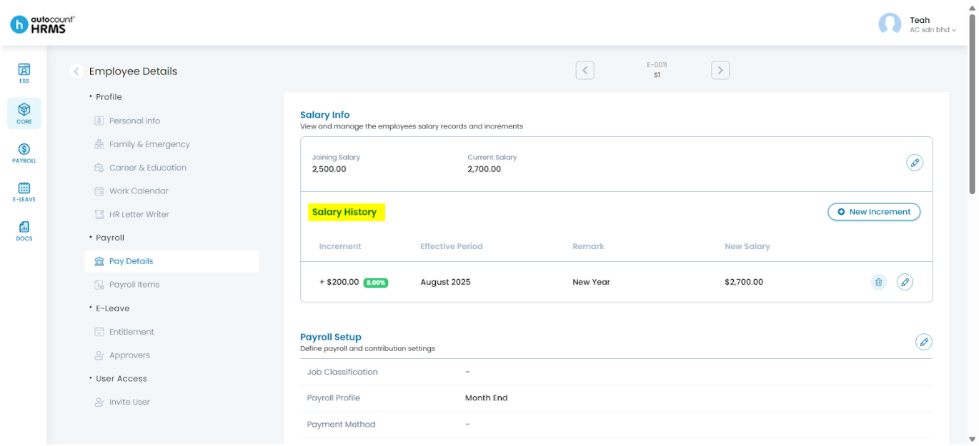 You can record and manage an employee’s salary increment in Employee Details > Pay Details. Once an increment is added, the system will automatically calculate and apply the new salary on the effective period.