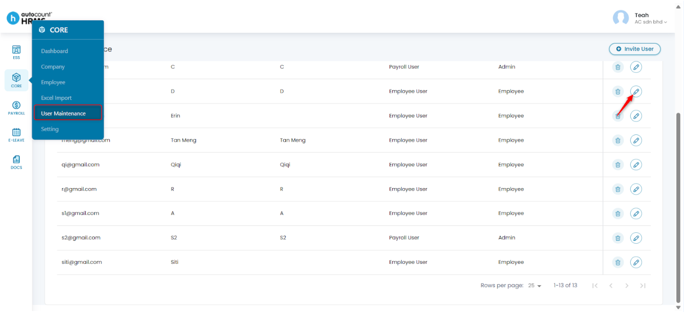 You can control what functions each user can access in HRMS—such as assigning leave approver or payroll management permissions—through User Maintenance in the Core module.