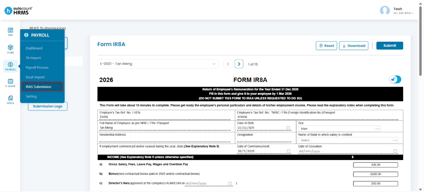 - Go to Payroll > IRAS Submission.