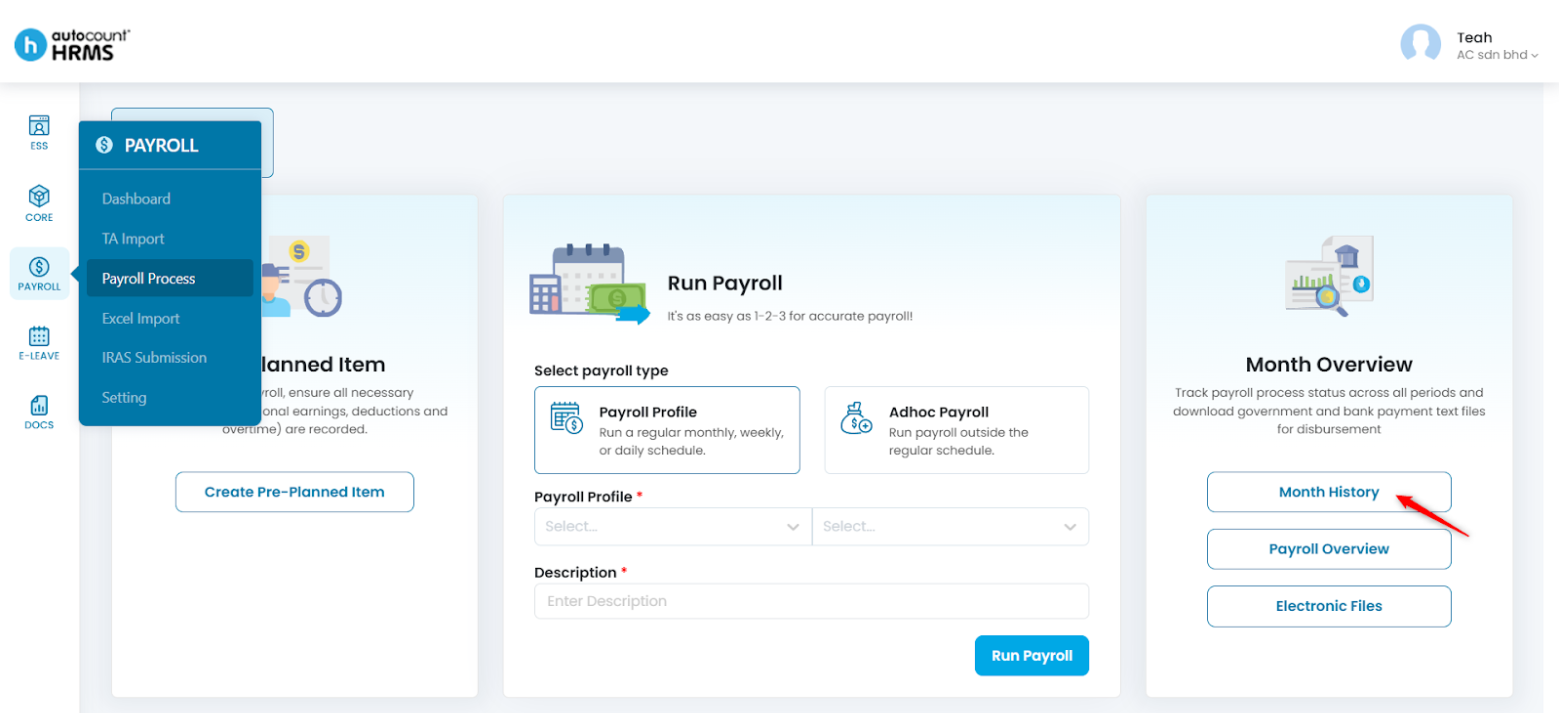 You can view the payroll history for a specific month at Payroll Process > Month History immediately after a payroll run.