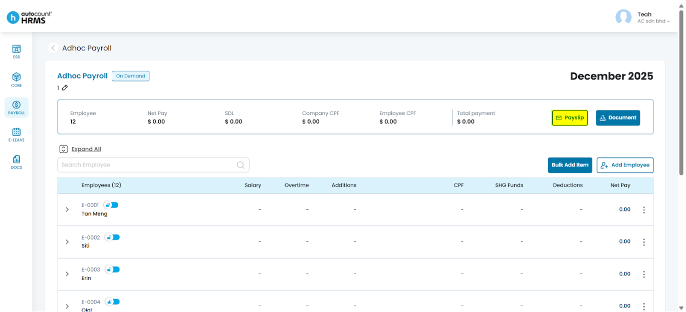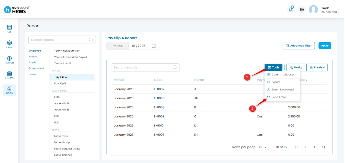 - Click Payslip, choose one or more delivery methods (Email, Notification, or Both), then click Send.