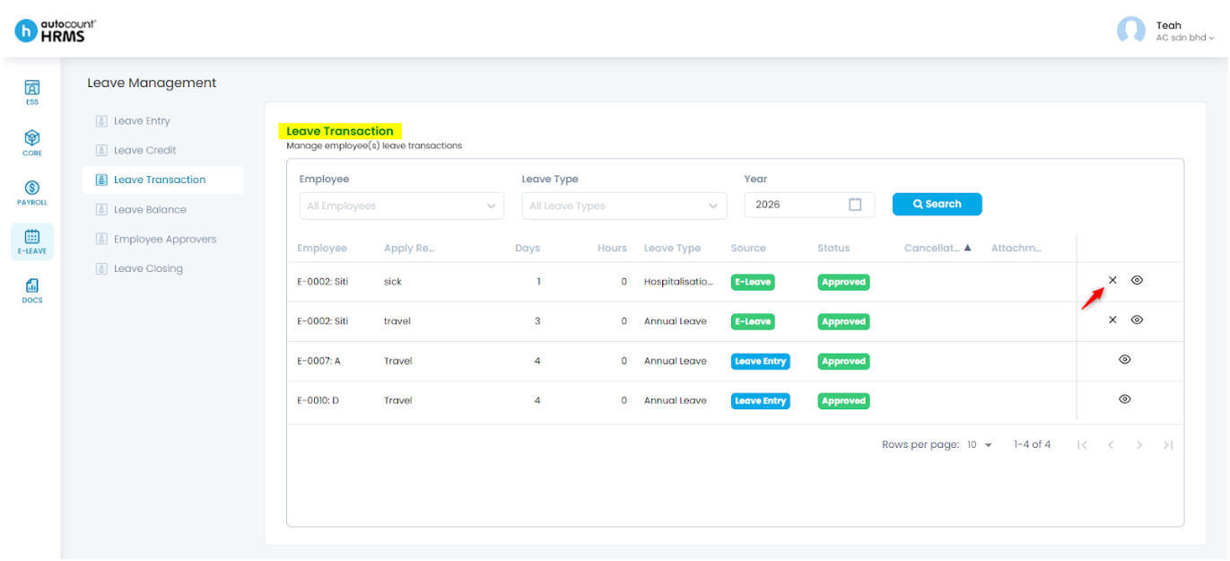 - Click the Cross (✕) icon next to the approved leave record.